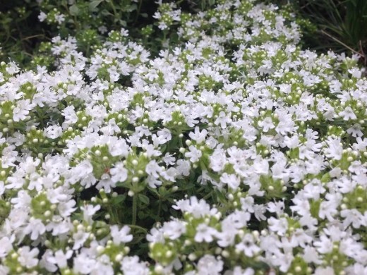 Растение высотой около 10 см. Относительно медленно растущий кустарничек с очень мелкими опушенными яркими зелеными листьями и белыми соцветиями. Цветет в июне-июле. Цветки маленькие, ароматные белые. Обладает приятным сильным ароматом и острым, сильно пряным, горьким вкусом.