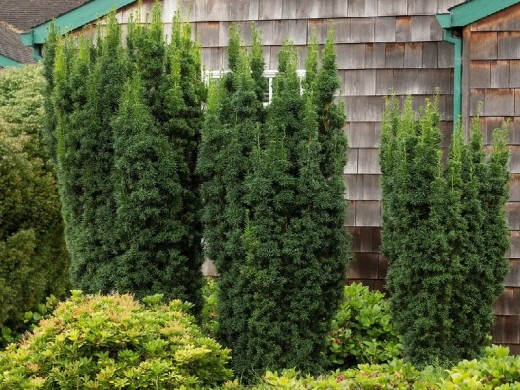 Тис средний "Hicksii" - теневыносливый вечнозеленый гибрид тиса остроконечного и тиса ягодного. Подходит для живых изгородей, создания топиарных форм. Взрослое растение достигает высоты 5-6 м, в диаметре до 3,5м. Форма кроны - колоновидная, сверху чуть расширена. Сильные, жесткие побеги вертикально направлены. Годовой прирост до 20 см. Предпочитает солнечные места, но хорошо переносит тень. Почвы нейтральные, плодородные, дренированные. Не переносит застойного увлажнения в прикорневой зоне. Морозостойкий, но молодые саженцы рекомендуется укрывать на зимний период. Устойчив к болезням. Хорошо реагирует на стрижку.(АБ).