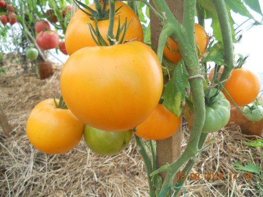 Томат "Хурма" относится к среднеспелым культурам. Срок полного созревания плодов занимает 115-120 дней. Куст среднерослый, с ограниченной силой роста. В высоту вытягивается от 70 до 100 см. Стебель мощный, хорошо развит. Крона разветвленная, но со слабой ветвистостью. Сорт штамбовый, поэтому пасынковать кусты не нужно. Плоды крупные, по форме плоскоокруглые и слаборебристые. Вес ягоды составляет 240 г. Кожица гладкая и тонкая. Мякоть сочная, мясистая и очень нежная. Помидоры Хурма имеют сладковатый вкус. При полном созревании появляется небольшая кислинка.И.К