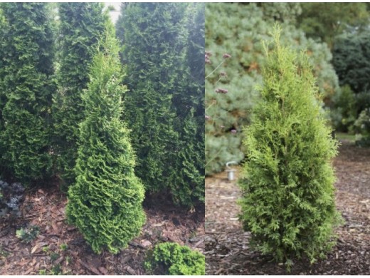Хвоя крупная, чешуевидная, темно-зеленая круглый год.