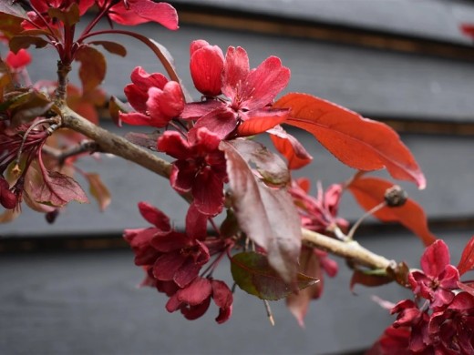 Цветки темно-малиновые, простые, до 3-4 см. Цветение обильное в мае.