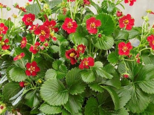 Листья тёмно-зелёные, зубчатые, трёхлопастные, образуют аккуратную розетку, из которой ниспадают длинные побеги, создавая каскадный эффект. С мая по июнь растение украшают яркие рубиново-красные цветки диаметром 2–3 см, которые позже превращаются в сочные, сладкие ягоды среднего размера 15 г, созревающие с июня до первых заморозков у ремонтантных сортов.