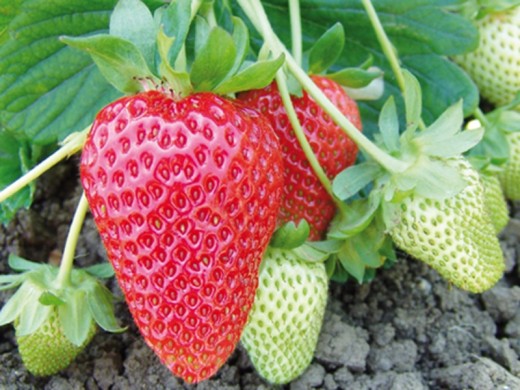Листья тройчатые, темно-зеленые, блестящие, формируют плотную розетку, устойчивую к внешним факторам. Цветки среднего размера, белые, диаметром 2–3 см, появляются волнами на крепких цветоносах. Ягоды крупные, 45 г. ,ярко-красные, блестящие, с интенсивным сладким вкусом и ярким земляничным ароматом.