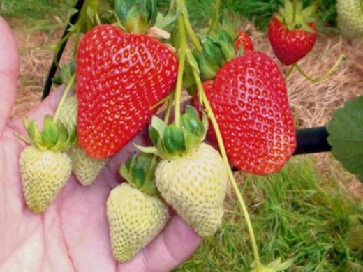 Листья тройчатые, темно-зеленые, с глянцевой поверхностью, образуют плотную розетку, защищающую ягоды от палящего солнца. Цветки белые, среднего размера, диаметром 2–2,5 см, появляются волнами с июня по сентябрь. Ягоды крупные, весом до 30 г, ярко-красные, блестящие, с плотной мякотью, сладким вкусом и легким земляничным ароматом.